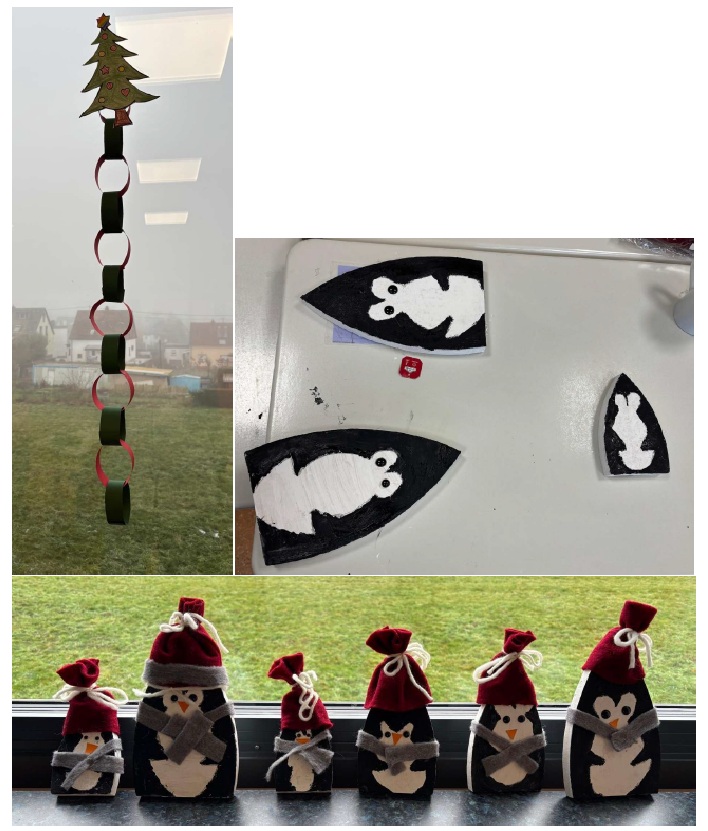 Der erste Projekttag stand ganz im Zeichen der Weihnachtsvorfreude. Die Klasse 3/4 gestaltete wunderschöne weihnachtliche Fensterdekorationen, die nun die Schulfenster schmücken und eine festliche Atmosphäre verbreiten. Außerdem bastelten die Kinder Schneemänner aus Styroporkugeln, die mit viel Liebe zum Detail verziert wurden. Ein weiteres Highlight waren die Holzpinguine, die die Schülerinnen und Schüler mit großem Geschick gestalteten.