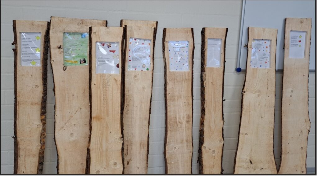Dann tippten die Schülerinnen und Schüler der Klassenstufe 6 Texte in den Computer ein, formatierten diese und gestalteten sie mit Bildern. Schließlich wurden die Texte laminiert und an den Brettern befestigt. Mit Klassenlehrerin Andrea Wagner machte sich die Klasse 6 dann auf den Weg, die Bretter ordnungsgemäß anzubringen.